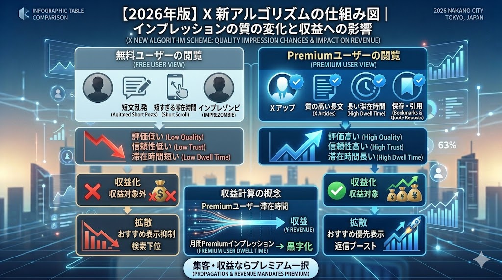 2026年の新ルールでは、収益の原資となるインプレッションは認証済みユーザー(Premium加入者)にどれだけ見られたかで算出されます。